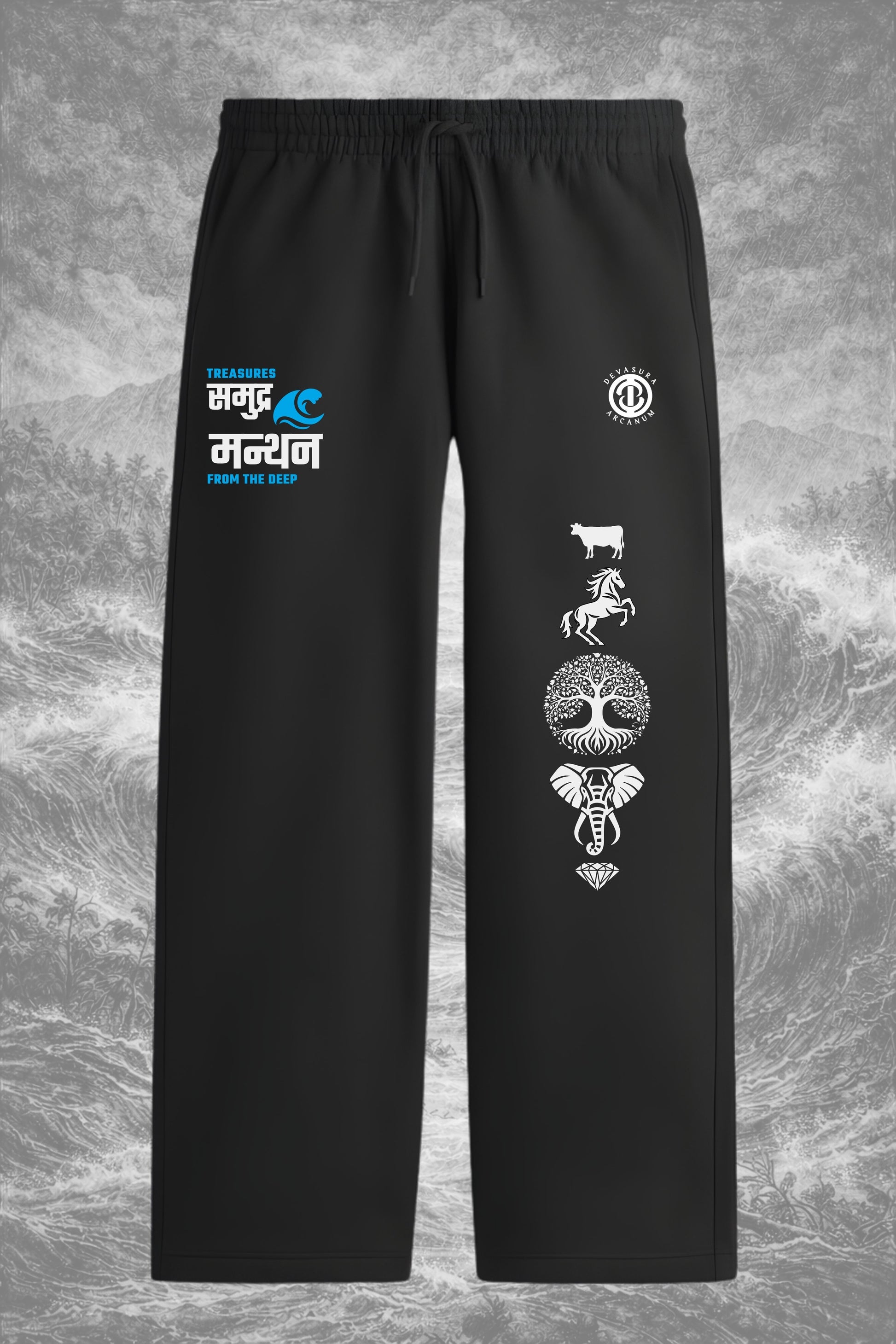 Samudra Manthan Korean sweatpants draw from the great churning of the ocean, when Devas and Asuras joined forces to stir the Kshira Sagara in search of Amrita. The right pocket declares “Samudra Manthan - Treasures From the Deep”, anchored by a rising wave in blue. Down the left leg, a vertical sequence of icons unfolds those treasures -